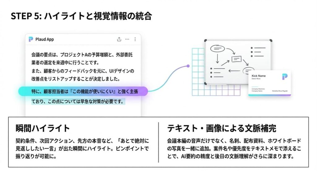 契約条件、次回アクション、先方の本音、社内共有が必要な懸念点など、あとで探し直すと大変な情報ほどハイライトと相性がいいです。